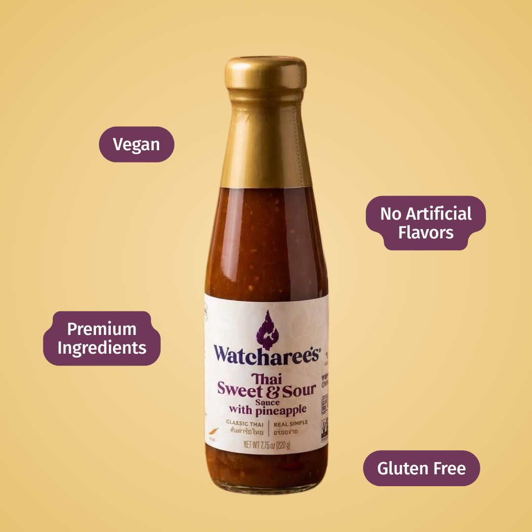 Thai sweet and sour stir fry, or Pad Priew Wan, is a Thai comfort food made from meat, seafood or tofu and vegetables with cashews for a crunch. Watcharee’s traditional recipe is a masterful fusion of tamarind, pineapple, and coconut sugar with a touch of ginger. This sauce will be your go-to for a quick stir fry or can brighten your grilled creations as a lively marinade or glaze.